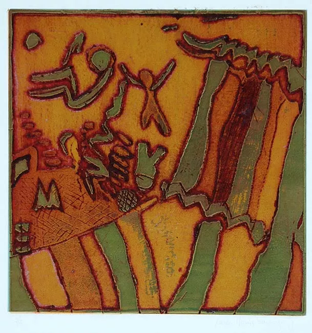Objeto de forma rectangular. Composición en base al rostro de una figura infantil de frente con el cabello liso hasta los hombros, de facciones finas. De color gris oscuro, contorno negro sobre fondo gris oscuro. Con inscripciones.
