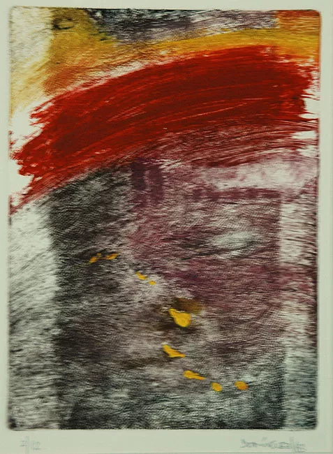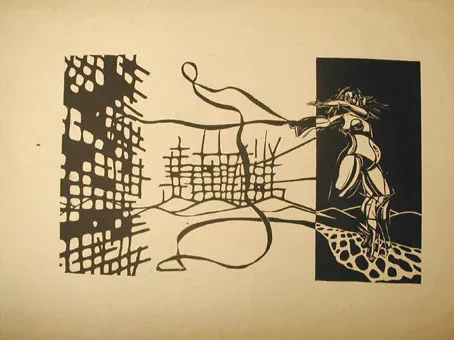 Obra bidimensional monocromática de formato rectangular, composición en base a embarcación a velas en medio de una superficie con ondulaciones, sobresalen unas formas irregulares de color blanco. En primer plano figuras de aves.