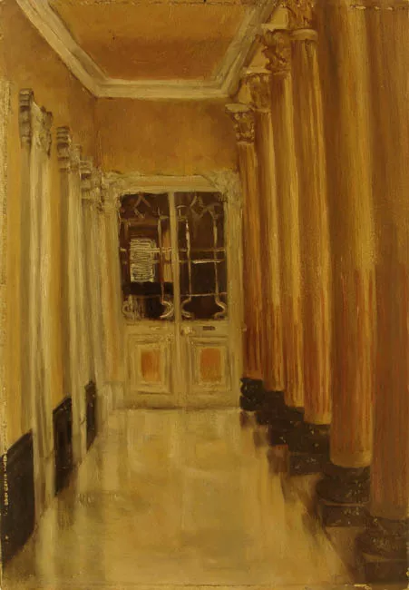 Obra de formato rectangular, disposición horizontal. Composición en base a paisaje campestre. En primer plano al costado derecho de la obra, se observa una construcción de color gris con techo color blanco sobre un suelo de color café claro y tonos verdes. Delante de ella, se observa una figura humana masculina de pantalones plomos y chaleco café y de manera central en la obra se observa una figura de gran tamaño de forma redondeada color café con tonos grises, sobre ella, se aprecia una figura humana de espalda al espectador de vestimenta gris. En segundo plano se visualiza colinas de color plomo. De fondo un cielo blanco con tonos celestes. Al costado inferior derecho de la obra, una firma.