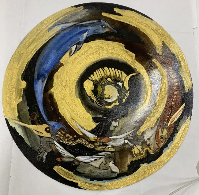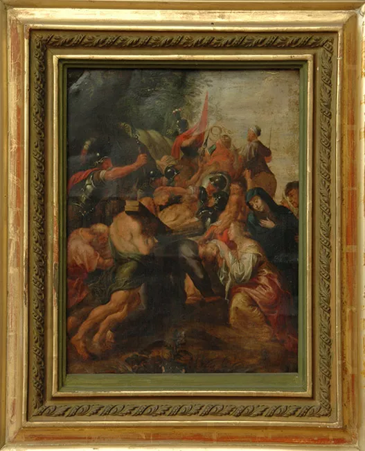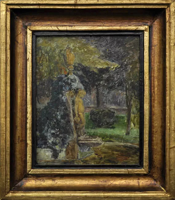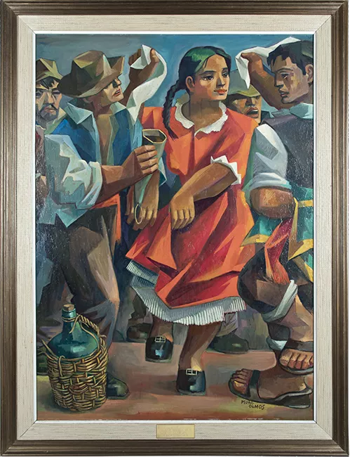 Obra de formato rectangular, orientación horizontal. Composición en base a tres figuras femeninas. En el primer plano una joven niña que viste un vestido de color rosado y detalles en azul, su cabello es largo, ondulado y rojizo. Detrás de ella se encuentran dos mujeres sentadas, una mira hacia las flores que posa en su falda y sostiene con sus manos, lleva puesto un vestido anaranjado y celeste, un manto de variados colores y un sombrero con flores. Sobre el hombro de ella, la segunda mujer posa su cabeza demostrando afecto y sobre su hombro posa una sombrilla, se entrevé su vestido con volados. Frente a estas dos mujeres hay una mesa de mantel blanco y encima tiene frutas, jarrones y tazas. Un sombrero se encuentra posado a un costado inferior derecho de la mesa. En segundo plano, un jardín con árboles, flores y edificaciones al fondo. Al extremo inferior derecho, una firma.