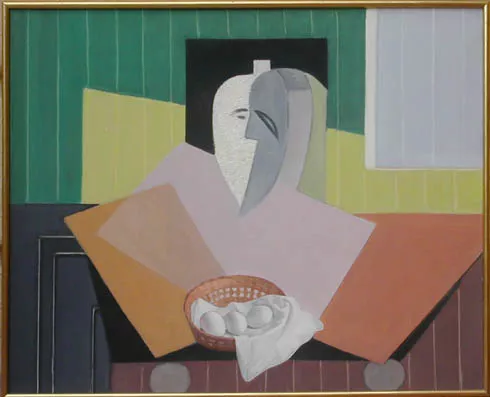 Obra de formato rectangular, disposición vertical. Composición en base al interior de una habitación. En un primer plano, en el eje central se encuentra un pájaro pequeño, atrás de él, al lado izquierdo hay una mesa de tamaño pequeño y tiene encima una paleta de pintura. A la derecha una fuente se sostiene con una estructura de fierro y al lado se encuentra un estante de madera apoyado sobre una pintura enmarcada que representa a dos figuras humanas, al mismo tiempo hay una tela colgada en la punta derecha del marco. Al costado izquierdo del estante, una figura femenina semidesnuda con la cabeza apoyada sobre su hombro izquierdo se tapa la parte inferior de su cuerpo con una tela y al lado derecho del mueble, una silla de madera y tapiz color rojo. Detrás de ésta una puerta entreabierta que da hacia otro espacio interior. Al costado inferior derecho, una firma.