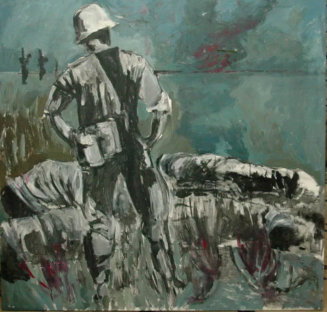 Obra rectangular, orientación vertical. Horizonte en la franja central...