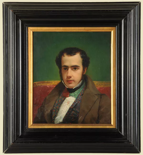 Obra de formato ovalado, naturaleza muerta. En primer plano un conjunt...