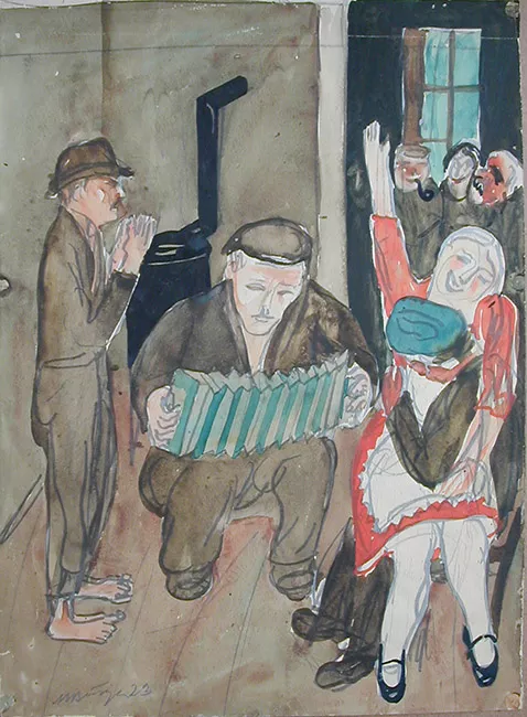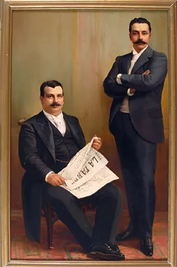 Obra de formato rectangular en orientación vertical. Pintura figurativa que representa un retrato masculino, de cuerpo completo, sedente. Se observa, al centro de una habitación, un hombre adulto, de pelo corto, castaño, barba y bigote, ojos celestes. Se encuentra vestido con un traje formal negro, camisa blanca y una banda presidencial (de colores azul, blanco y rojo) que atraviesa su pecho, el hombre se percibe tranquilo. Cruza sutilmente sus pies en el suelo, mientras sus brazos se apoyan en la silla. Esta última es tipo sitial, de madera tallada con tapizado de terciopelo rojizo. Al fondo se observa un elegante salón, de muros blancos, con cortinajes, columnas, sitiales y obras decorativas. Marco dorado.