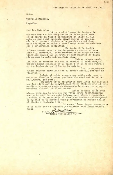 [Carta] 1954 febrero 20, Santiago, Chile [a] Gregorio Marañón, Madrid [manuscrito] Matilde Ladrón de Guevara.