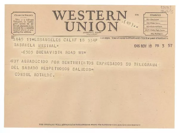[Telegrama] 1946 nov. 18, Los Angeles, Calif., [Estados Unidos] [a] Gabriela Mistral [manuscrito] Cónsul Rotalde.
