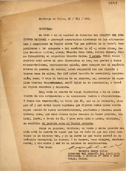 [Carta] 1956 jul. 28, Santiago, Chile [a] Gabriela Mistral [manuscrito] Ernesto Boero Lillo.