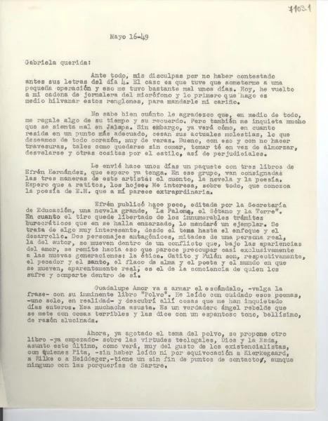 [Carta] 1952 oct. 5, Santiago, Chile [a] Gabriela [Mistral] [manuscri...