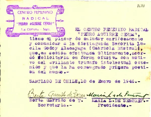 [Telegrama] 1945 nov. 21, [Brasil] [al] Doctor Eduardo Santos, Bogotá, Colombia [manuscrito] Gabriela Mistral.
