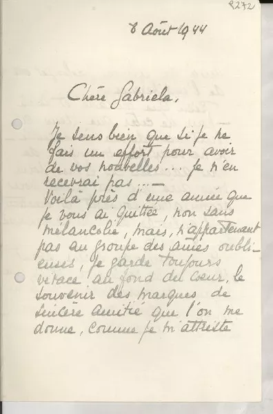 [Carta] 1944 août. 8, [s. l.] [a] Gabriela Mistral [manuscrito] Horte...