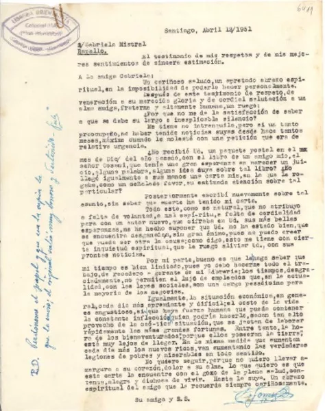 [Carta] 1950 abr. 6, Santiago, [Chile] [a] Gabriela Mistral, México [...