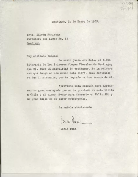 [Carta] 1965 ene. 11, Santiago, [Chile] [a] Srta. Zulema Munizaga, Directora del Liceo No. 13, Santiago [manuscrito] Doris Dana.