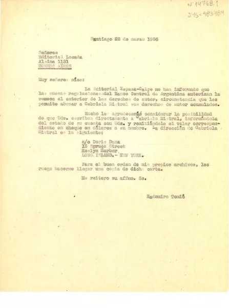 [Carta] 1956 mar. 22, Santiago, [Chile] [a] Editorial Losada, Buenos Aires, [Argentina] [manuscrito] Radomiro Tomic.