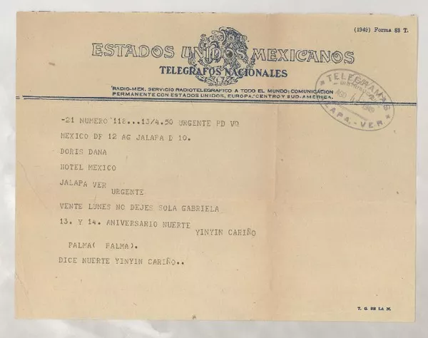 [Telegrama] 1949 ago. 12, México D. F. [a] Doris Dana, Jalapa, Veracruz [manuscrito] Palma Guillén.