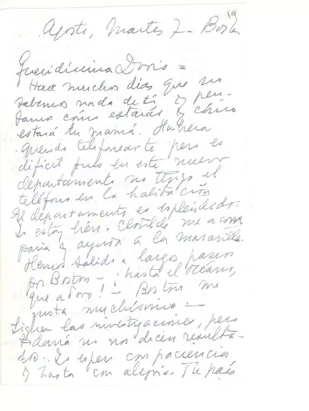 [Carta] 1962, ago. 7, Boston, Massachusetts [al] Doris Dana, [New YorK] [manuscrito] Esther de Cáceres.