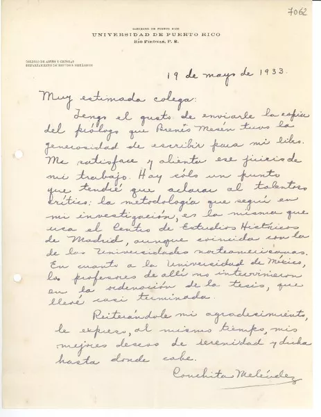 [Carta] 1933 mayo 19, Río Piedras, Puerto Rico [a] Gabriela Mistral [manuscrito] Conchita Meléndez.