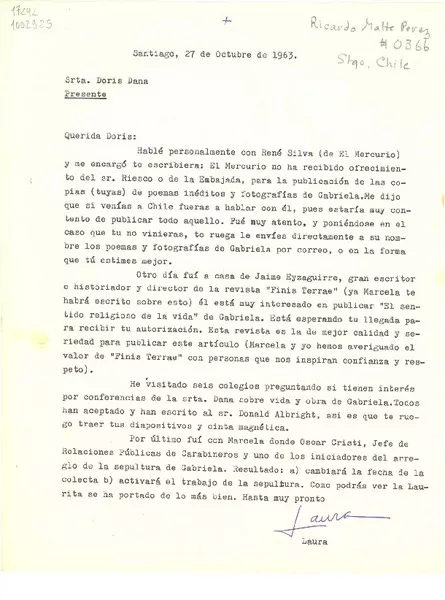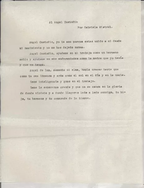 Al ángel custodio [manuscrito] Gabriela Mistral. 1 h. ; 28 cm.