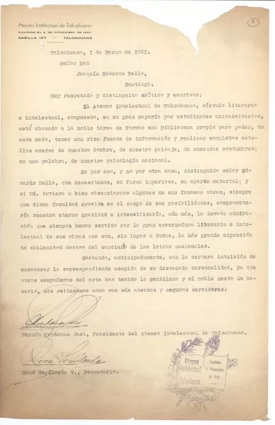[Carta] 1951 ago. 1, Talcahuano, Chile [a] Joaquín Edwards Bello [manuscrito] Hernán Pradenas Jara.