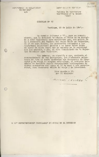 Circular N° 55, 1948 jul. 20, Santiago, [Chile] [a] Los representantes consulares de Chile en el exterior [manuscrito] Manuel Trucco.