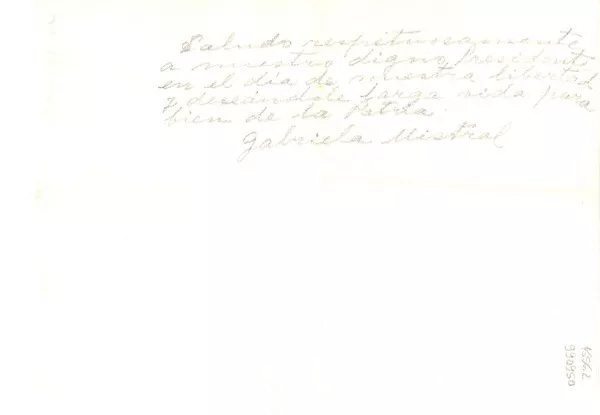 [Carta] [al] Presidente [manuscrito] Gabriela Mistral. 1 h. ; 16 x 23...