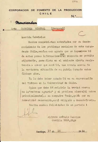 Memorandum, 1954 sept. 13, Santiago, [Chile] [a] Gabriela Mistral [manuscrito] Alfredo Arévalo Cancino.