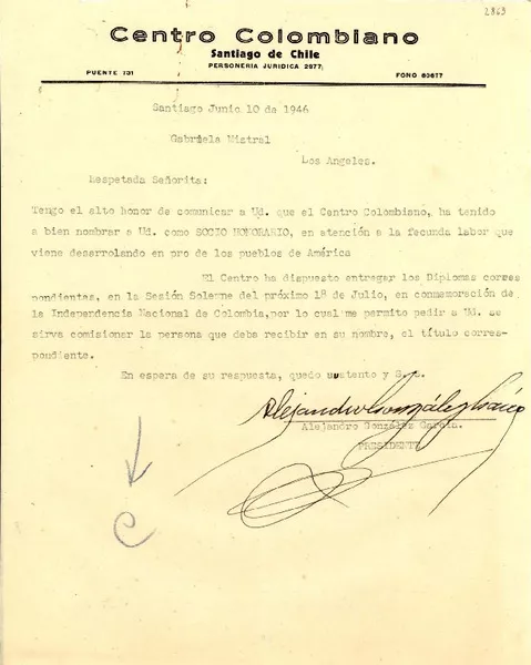 [Carta] 1946 jun. 10, Santiago de Chile [a] Gabriela Mistral, Los Angeles [manuscrito] Centro Colombiano.