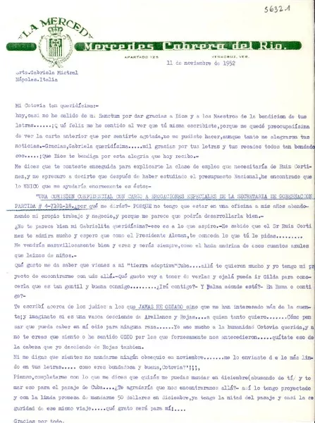 [Carta] 1952 nov. 11, Veracruz, [México] [a] Gabriela Mistral, Nápoles...
