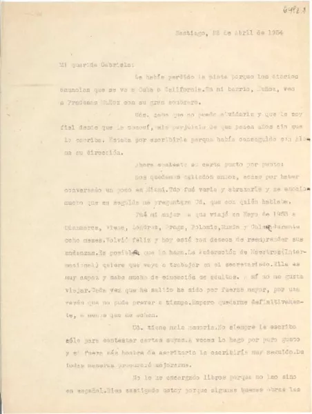[Carta] 1954 abr. 22, Santiago, [Chile] [a] Gabriela [Mistral] [manus...