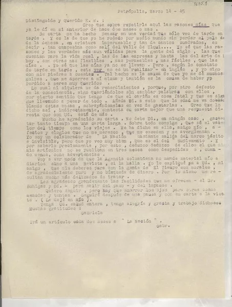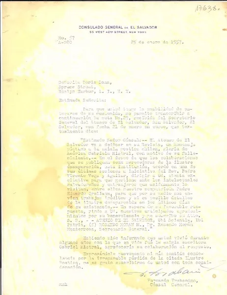 [Carta] 1957 ene. 25, New York [a] Doris Dana, Roslyn Harbor, N.Y. [manuscrito] Fernando Trabanino.