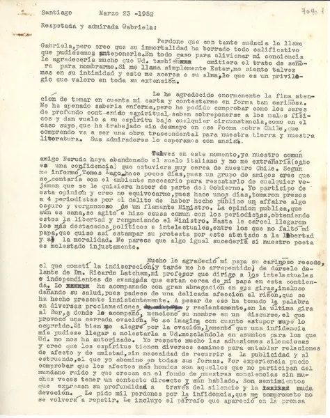 [Carta] 1952 mar. 23, Santiago [a] Gabriela Mistral [manuscrito] Este...