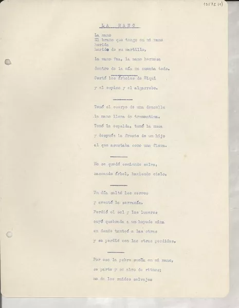 La mano [manuscrito] [Gabriela Mistral]. 5 h. ; 26 cm.