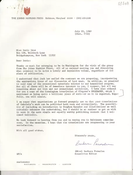 [Carta] 1969 July 23, [Baltimore, Maryland, Estados Unidos] [a] Miss Doris Dana, Box 188, Hildreth Lane, Bridgehampton, New York [manuscrito] (Miss) Barbara Parmelee.
