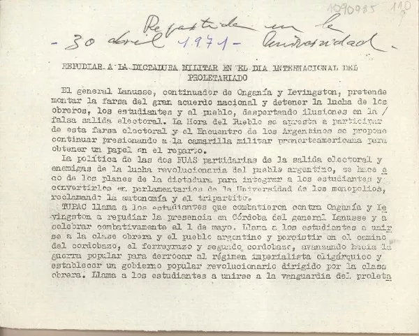 [Panfleto universitario] [manuscrito] Tupac.