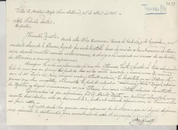 [Carta] 1951 abr. 27, San Antonio, Tenerife, [España] [a] Gabriela Mistral, Rapallo, [Italia] [manuscrito] Félix Duarte.