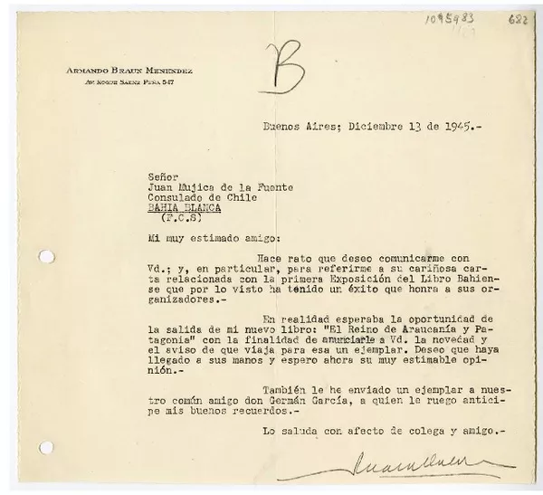 [Carta] 1945 diciembre 13, Buenos Aires, Argentina [a] Juan Mujica, Bahía Blanca, Argentina [manuscrito] Armando Braun Menéndez