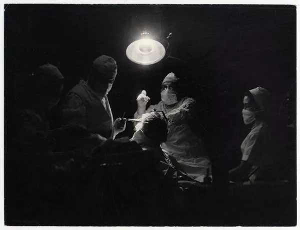 [Pabellón de neurocirugía: Equipo médico durante una intervención quirúrgica] [fotografía] Domingo Ulloa.