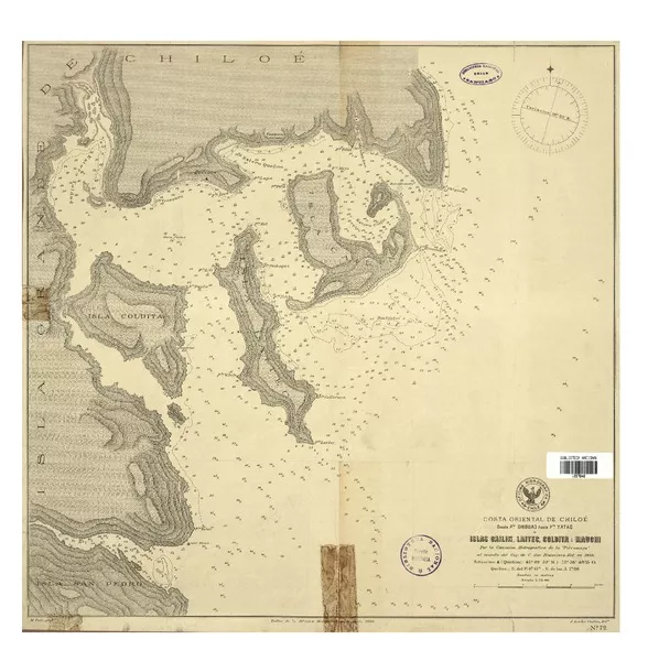 Costa oriental de Chiloé desde Pta. Chiguao hasta Pta. Yatac Islas Cailin, Laitec, Coldita, Mauchi [material cartográfico] : por la Comisión Hidrográfica de la "Pilcomayo" al mando del Cap. de C. don Francisco Nef, en 1896.