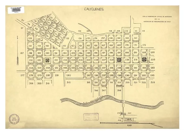 Cauquenes con la numeración oficial de manzanas [material cartográfico] : de la Asociación de Aseguradores de Chile.