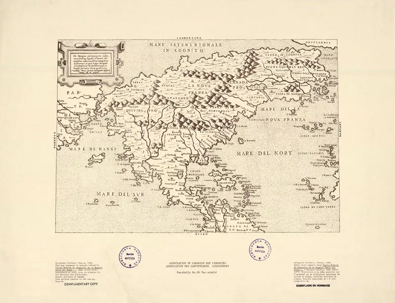 Il disegno del discoperto della nova Franza ilquale s'c havuto ultimamente dalla novissima navigatione de Franzesi in quel luogo: nel quale si uedono tutti l'Isole, Porti, Capi, et luoghi fra terra chein quella sono [material cartográfico] : Bolognini Zalterii.