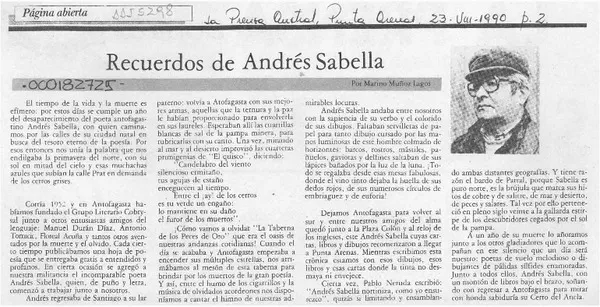 Recuerdos de Andrés Sabella [artículo] Marino Muñoz Lagos.