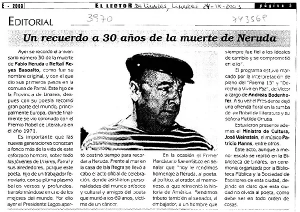 Un recuerdo a 30 años de la muerte de Neruda [artículo]. retr.