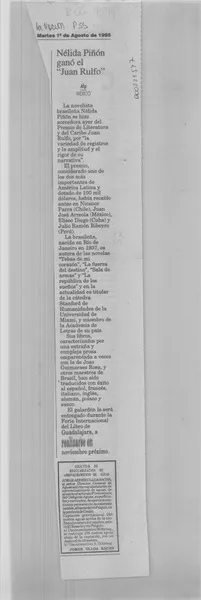 Nélida Piñón ganó el "Juan Rulfo" [artículo].