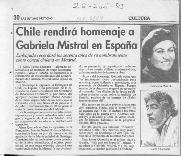 Chile rendirá homenaje a Gabriela Mistral en España [artículo]. retr.