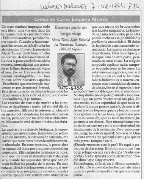 Escenas para un largo viaje [artículo] Carlos Jorquera Alvarez. retr.