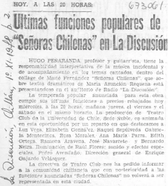 Ultimas funciones populares de "Señoras chilenas" en La Discusión. [artículo]