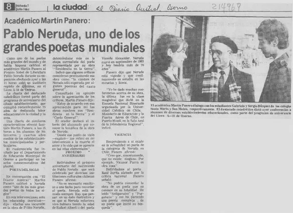 Académico Martín Panero, "Pablo Neruda, uno de los grandes poetas mundiales" [artículo].