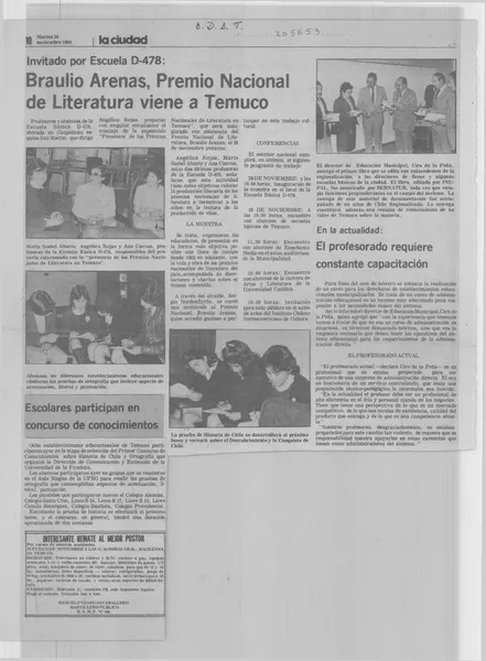Braulio Arenas, Premio Nacional de Literatura viene a Temuco [artículo].