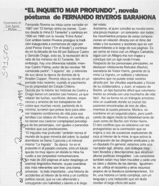 "El inquieto mar profundo", novela póstuma de Fernando Riveros Barahona [artículo] Luis Agoni Molina