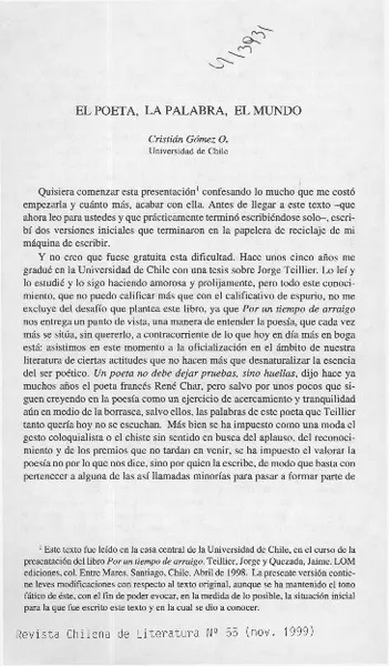 El poeta, la palabra, el mundo [artículo] Cristián Gómez O.