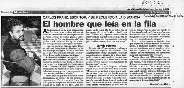 El hombre que leía en la fila [artículo] Claudio Pereda. retr.